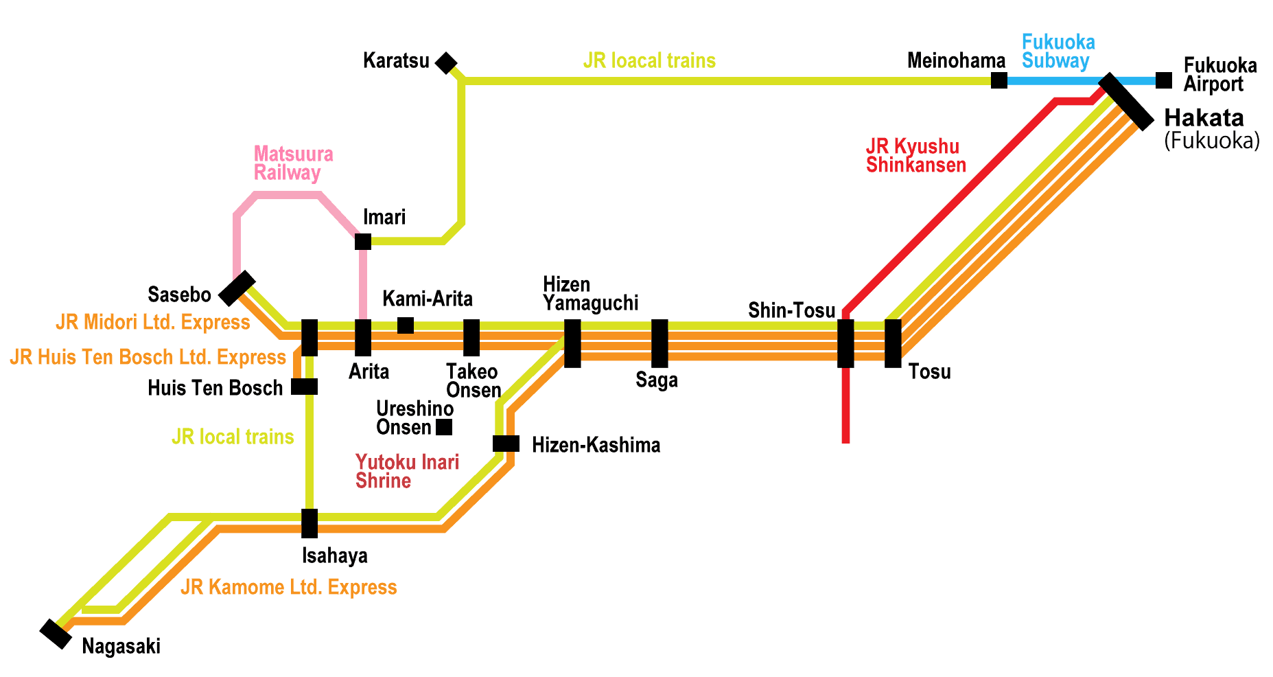 ท่านสามารถนั่งรถไฟสาย JR Huis Ten Bosch Express จากสถานี JR Hakata (ฟุกุโอกะ) ใช้เวลา 1 ชั่วโมง 40 นาที