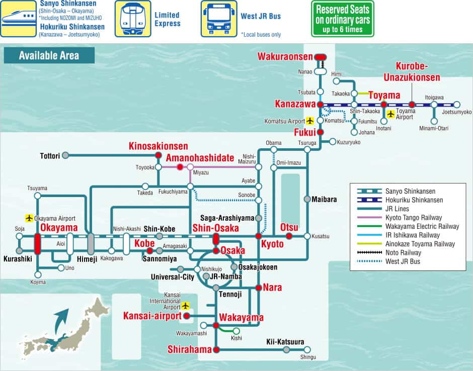 JR Kansai-Hokuriku Area Pass ไม่สามารถใช้กับ Hokoriku Shinkansen (Joetsu Myoko – Tokyo) Tokaido Shinkansen (Shin Osaka – Tokyo) Sanyo Shinkansen (Okayama – Hakata)