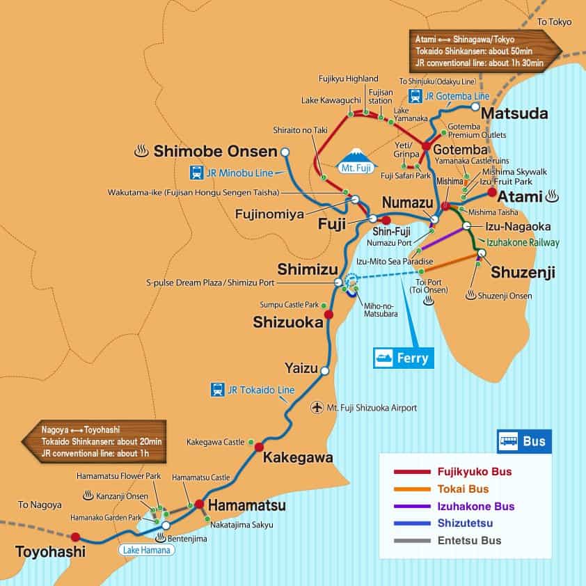 บัตร JR Mt.Fuji-Shizuoka Tourist pass mini 3 Day เดินทางท่องเที่ยวในเขตจังหวัดชิสุโอกะ ด้วยรถไฟและรถบัสในเครือ JRและพันธมิตรที่ครอบคลุมเส้นทางตั้งแต่ ชิสึโอกะ,ภูเขาไฟฟูจิ,ทะเลสาบคาวาคุชิโกะ,โกเทมบะ,เมือง อะตามิ และ เมือง อิสุ ที่เป็นจุดชมวิวและถ่ายรูปที่สวยงาม สถานที่ท่องเที่ยวที่มีชื่อเสียง และยังมีออนเซ็นที่มีชื่อมากมายตั้งอยู่ด้วย