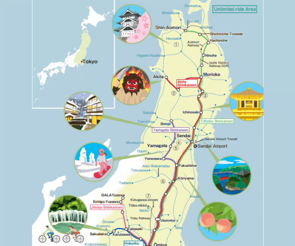 ท่านสามารถศึกษาดูเส้นทางการให้บริการของ JR East Pass Tohoku — คลิกที่นี่